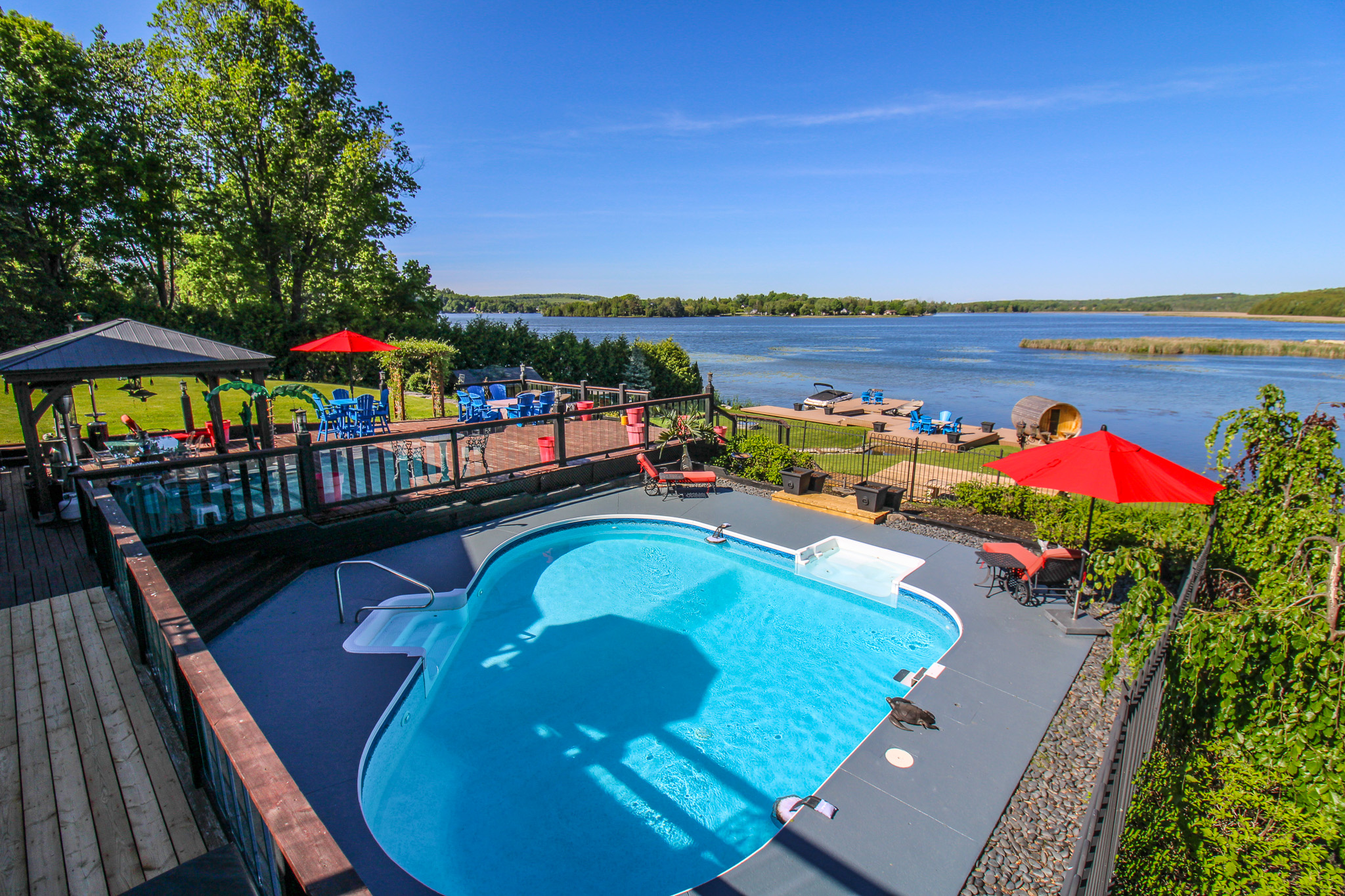 Gym, lake side sauna, private outdoor pool, indoor hot tub, kayaks and more.